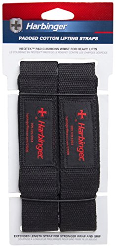 Details: Product Description The Harbinger Padded Cotton Lifting Straps with NeoTek Cushioned Wrists make it possible to pull more weight and throw up more reps in the gym. Ideal for weightlifting, bodybuilding, powerlifting, and strength training, each pair of straps features NeoTek cushioning to take pressure off the hands and wrists during heavy lifting. The extended length of 21.5 inches provides a stronger wrap on the bar, while the 1.5-inch width increases contact on the grip surface, resulting in less grip fatigue. Use of barbells, dumbbells, bumper plates and kettlebells to maximize gains in the gym with improved grip strength. Heavy duty stitching increases durability and the merrowed end tabs prevent fraying. The Harbinger Padded Cotton Lifting Straps with NeoTek Cushioned Wrists is sold as a pair. Amazon.com Boost your lifting performance without sacrificing comfort with this pair of cotton padded lifting straps. Measuring 21 inches long and 1.5 inches wide, each strap offers 5 mm of foam padding to protect your hands during lifting. As a result, your hands won’t develop nasty calluses as you perform pull-ups, seated rows, and other upper body exercises. Even better, the straps wrap tightly around the bar to increase traction and maximize gripping strength, helping you lift more weight than ever before. A must for lifters trying to develop strength or add bulk, the 1.5-inch wide straps offer 20 percent more gripping area than typical straps.