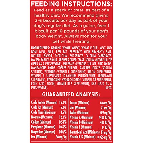 Details: Make your dog?s life more fun with delicious dog snacks from a brand you can trust. Milk-Bone Original dog biscuits are prepared with care and will give your dog the simple, genuine joy that your dog gives you every day. How? A classic crunch with a wag-worthy taste ? now with even MORE meaty taste compared to the Milk-Bone Original biscuits you know and love. Better yet, the crunchy texture of Milk-Bone dog biscuits helps freshen dogs? breath and reduce tartar build-up, so you can fully enjoy all those sloppy doggie kisses. These tasty dog treats even contain vitamins and minerals ? 12, to be exact. So you?ll be almost as happy to give them as your dog is to get them ? almost.