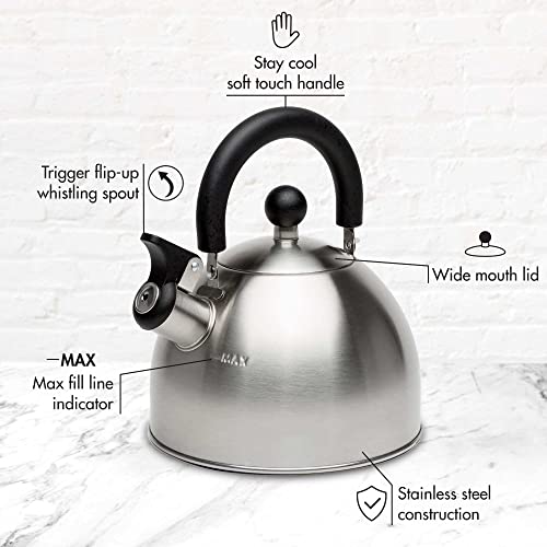 Primula Stewart Whistling Stovetop Tea Kettle Food Grade Stainless Steel, Hot Water Fast to Boil, Cool Touch Folding, 1.5 Qt, Brushed with Black Handle