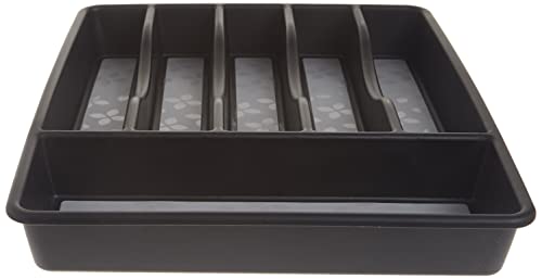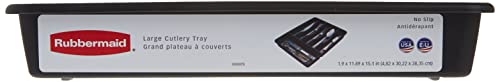 Details: Rubbermaid no slip cutlery tray, Large, Black (1994536). great silverware tray at a value price. 5 Large slots and 2 expandable trays provide storage space for all of your flatware and serving utensils. The no slip base and feet keep the utensil organizer in place as the drawer opens and closes. Made from durable plastic that is sturdy with a high class look. Easy to clean and dishwasher safe. For nearly 80 years, Rubbermaid has represented innovative, high quality products that help simplify life. Recognized as a “brand of the century” for its impact on the American way of life.