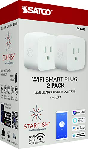Details: The Satco Starfish S11269 WiFi Smart Plug Outlet for Small Appliances enables smart on/off control through your plug-in outlets. The 2.4 GHz WiFi smart plug can be controlled via the downloadable Starfish app to control small appliances such as table lamps, coffee makers, and other electronics, all from the convenience of your mobile device or by using voice control with Siri, Alexa, Google Assistant, and SmartThings. The grounded smart plug is rated for 10A / 1250 Watts and features an on/off switch located on the outlets for manual override. The smart plug measures 1.99 x 1.99 x 1.99 inches, comes in a white finish, and is Dry Location Listed, cETLus Listed, RoHS Compliant, and FCC Listed for safety.