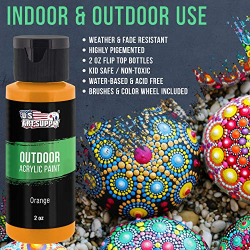 - 24 High-Quality Vivid Colors in Large 2 oz. Bottles: A full selection of 24 unique, eye-catching vibrant water-based acrylic colors that allow you to create stunning vivid masterpieces. U.S. Art Supplies superior performing weather and fade resistant artist outdoor acrylic paint will bring your artwork to life. They’re ideal for use by professional artists, as well as the young aspiring artist.