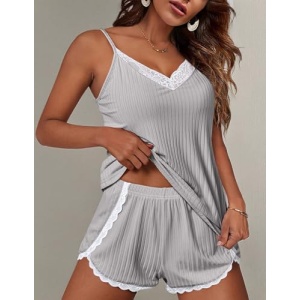 Ekouaer Womens Pajama Sets Soft Lingerie Sleepwear 2 Piece Cami Shorts Set V Neck Pj Lace Nightwear Grey X-Large